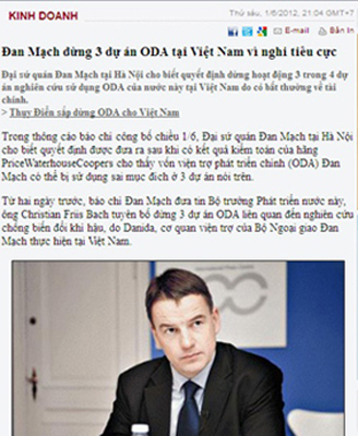 Báo Tiền phong, Người Lao động, Nông thôn ngày nay, Pháp luật TP.HCM (2/6), Lao động (4/6) cho biết, ngày 1/6, Đại sứ quán Đan Mạch tại Hà Nội ra thông cáo cho biết đã tạm dừng 3 dự án liên quan đến biến đổi khí hậu của Việt Nam. Quyết định này được đưa ra sau khi một điều tra độc lập do Công ty Kiểm toán Price Waterhouse Coopers (PWC) thực hiện, đã phát hiện có một số vấn đề bất thường tại các dự án này. Lượng vốn bị sử dụng sai mục đích có thể lên đến 3,3 triệu kroner (khoảng 11,5 tỉ đồng). VnExpress (5/6), VietNamNet, Nông thôn ngày nay (7/6) phản ánh, cả 3 đơn vị quản lý dự án đều khẳng định “không có tham nhũng, thất thoát” khi sử dụng vốn ưu đãi của Chính phủ Đan Mạch, mà có thể kiểm toán quốc tế chưa hiểu quy trình và thực tế dự án tại Việt Nam. Dân trí, Nông thôn ngày nay (7/6) cho biết thêm, Thứ trưởng Bộ Khoa học và Công nghệ Trần Việt Thanh khẳng định: 3 dự án bị Đan Mạch tạm ngừng viện trợ sẽ xử nghiêm nếu có sai phạm. Báo Tuổi trẻ TP.HCM, Tiền phong (7/6) đưa tin, ngày 6/6, đại diện chủ quản ba dự án biến đổi khí hậu mà Đan Mạch đang tạm dừng đã gặp gỡ với Đại sứ quán Đan Mạch tại Hà Nội. TS Vũ Thị Thu Lan, Phó viện trưởng Viện Địa lý (Viện Khoa học - công nghệ Việt Nam) cho biết, tại cuộc gặp, đại sứ Đan Mạch bày tỏ thiện chí rất rõ: “vấn đề ở đây chỉ là hiểu lầm”. Theo báo Công an nhân dân (8/6), Thứ trưởng Bộ Khoa học - Công nghệ Trần Việt Thanh cho biết, sau buổi làm việc với Đại sứ quán Đan Mạch vào ngày 6/6, trên tinh thần chung, Đan Mạch sẽ xem xét, thẩm tra lại báo cáo từ phía Việt Nam cũng như báo cáo của đơn vị kiểm toán phía Đan Mạch. Ngay sau khi có kết quả, Bộ Khoa học - Công nghệ sẽ công bố công khai trên các phương tiện thông tin đại chúng. Tuy nhiên, cả 3 đơn vị thực hiện 3 dự án bị tạm ngừng đều khẳng định không có sai phạm, đã có sự hiểu nhầm trong báo cáo của kiểm toán Đan Mạch. Đan Mạch sẽ làm việc trực tiếp với từng dự án để làm rõ vụ việc.