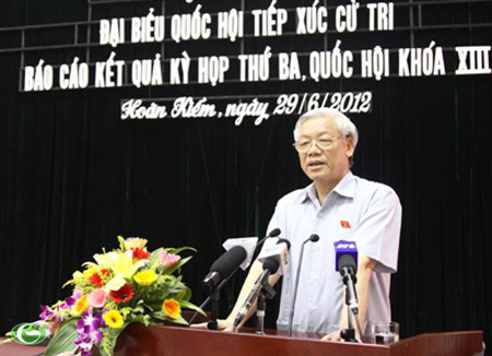 TTXVN, báo Nhân dân, Quân đội nhân dân, Tin tức, Pháp luật VN, Lao động, Tiền phong, Nông thôn ngày nay, Tuổi trẻ TP.HCM, Thanh niên (30/6), một số báo địa phương: SGGP, Hải Phòng, Quảng Ninh, Thái Nguyên, Bắc Giang… (30/6), Hà Nội mới (1/7) đồng loạt phản ánh, Tổng Bí thư Nguyễn Phú Trọng và các đại biểu Quốc hội TP. Hà Nội đơn vị bầu cử số 1, đã tiếp xúc cử tri hai quận Ba Ðình và Hoàn Kiếm; Phó Thủ tướng Nguyễn Thiện Nhân cùng Đoàn đại biểu Quốc hội tỉnh Bắc Giang đã tiếp xúc cử tri 6 xã thuộc huyện Hiệp Hòa để báo cáo kết quả kỳ họp thứ ba, Quốc hội khóa XIII. Cử tri đề nghị Quốc hội cần kiên quyết hơn nữa trong việc giám sát; xử lý nghiêm cán bộ sai phạm, nhất là cán bộ đứng đầu cơ quan, đơn vị, doanh nghiệp. Việc chống tiêu cực, tham nhũng phải làm nghiêm, quyết liệt hơn và gắn với thực hiện Nghị quyết Trung ương 4 (khóa XI). Về vấn đề này, Tổng Bí thư nhấn mạnh: cán bộ, đảng viên và nhân dân cùng có trách nhiệm phòng, chống tham nhũng. Việc kiểm điểm theo tinh thần Nghị quyết Trung ương 4 (khóa XI), tháng 7 này sẽ làm từ cấp cao nhất; nhìn vào sự thật, nói hết sự thật để sửa chữa; phải làm cho dân tin bằng đường lối, chính sách, những kế hoạch cụ thể, những con người hết lòng vì Đảng, vì nước, vì dân. Theo Tổng Bí thư, chống tiêu cực, tham nhũng dứt khoát phải làm.