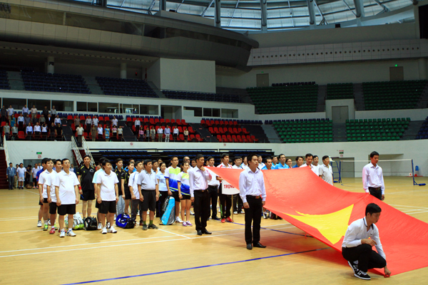 | Đồng chí Lê Minh Trí, Bí thư đảng ủy, Phó trưởng Ban Nội chính Trung ương trao huy chương cho các đội đạt thành tích nội dung cầu lông đôi Nam |