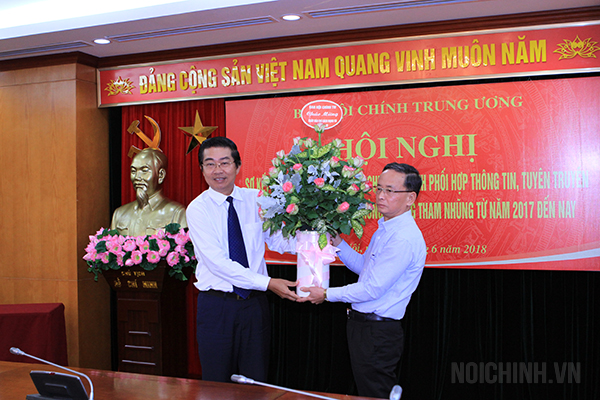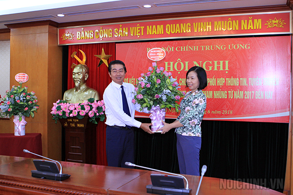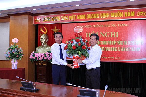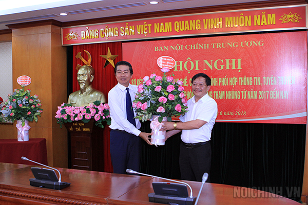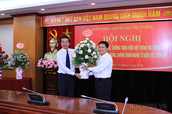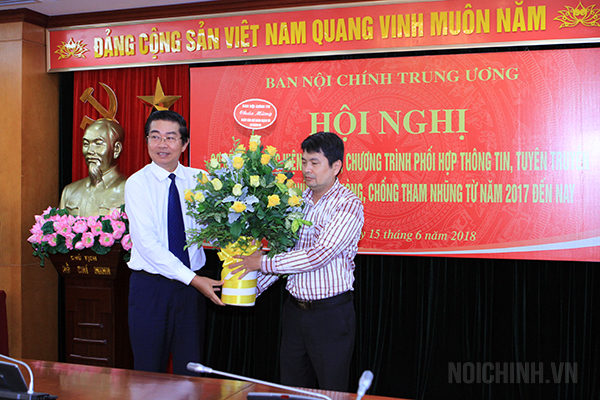 Đồng chí Võ Văn Dũng, Ủy viên Trung ương Đảng, Phó Trưởng ban Thường trực Ban Nội chính Trung ương thay mặt Lãnh đạo Ban tặng hoa, chúc mừng các cơ quan báo chí tham dự Hội nghị nhân Kỷ niệm 93 năm Ngày báo chí Cách mạng Việt Nam (21/6/1925 – 21/6/2018)