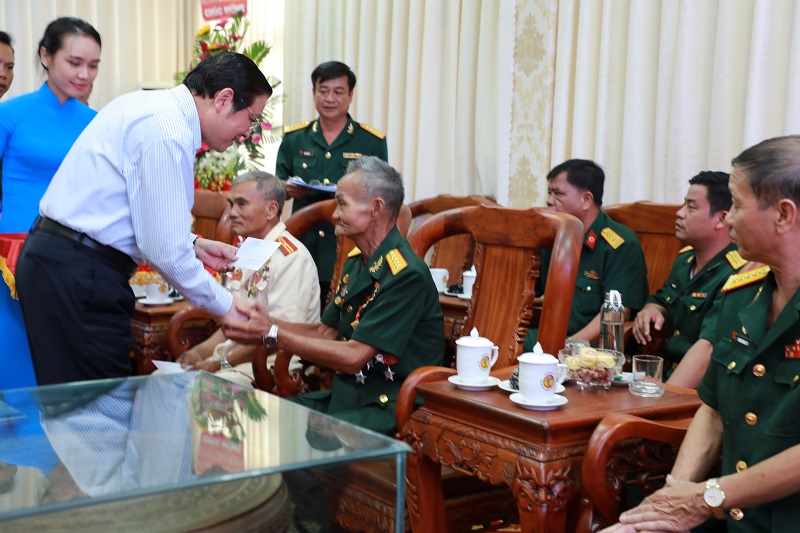 | Đồng chí Phan Đình Trạc tặng Hoa chúc mừng cán bộ, chiến sỹ Bộ Chỉ huy Quân sự tỉnh Tây Ninh và tặng quà cho thương binh tiêu biểu |