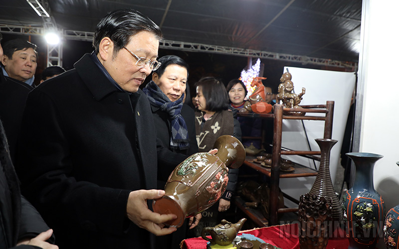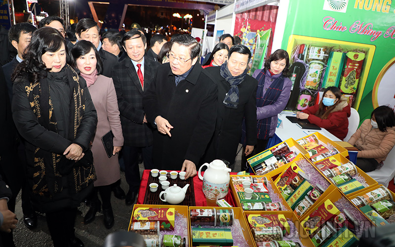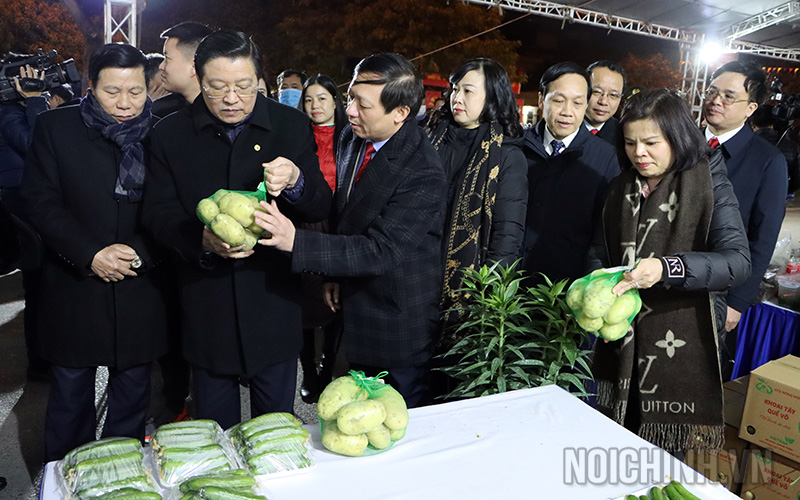 Đồng chí Phan Đình Trạc, Bí thư Trung ương Đảng, Trưởng Ban Nội chính Trung ương thăm một số gian hàng phúc lợi cho công nhân, lao động tại Phiên chợ nghĩa tình, tỉnh Bắc Ninh