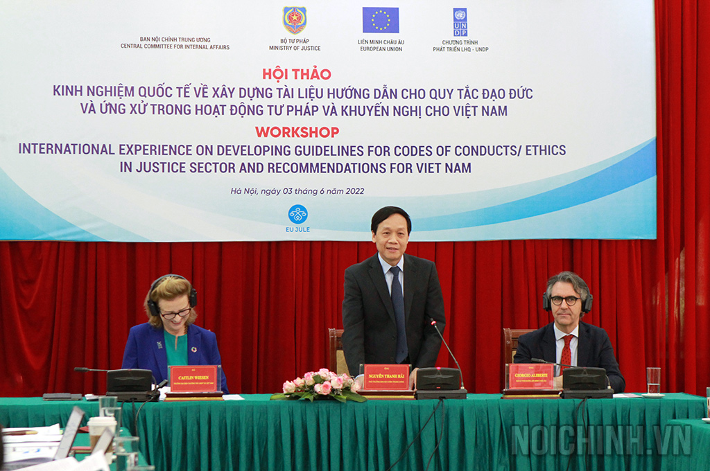 | Đồng chí Phan Đình Trạc, Ủy viên Bộ Chính trị, Bí thư Trung ương Đảng, Trưởng Ban Nội chính Trung ương, Phó Trưởng ban Thường trực Ban Chỉ đạo xây dựng Đề án "Chiến lược xây dựng và hoàn thiện Nhà nước pháp quyền xã hội chủ nghĩa Việt Nam đến năm 2030, định hướng đến năm 2045" phát biểu tại Tọa đàm |