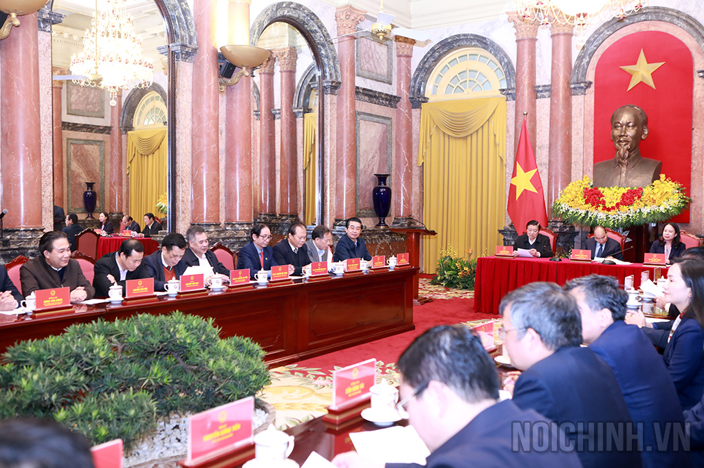 | Đồng chí Nguyễn Xuân Phúc, Chủ tịch nước, Trưởng Ban Chỉ đạo xây dựng Đề án "Tiếp tục xây dựng hoàn thiện Nhà nước pháp quyền xã hội chủ nghĩa Việt Nam trong giai đoạn mới" phát biểu |