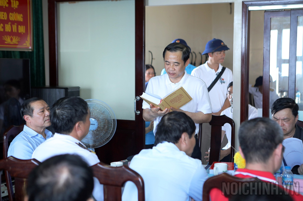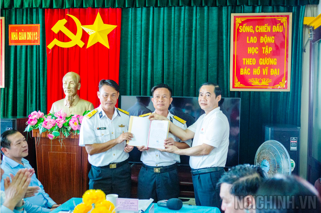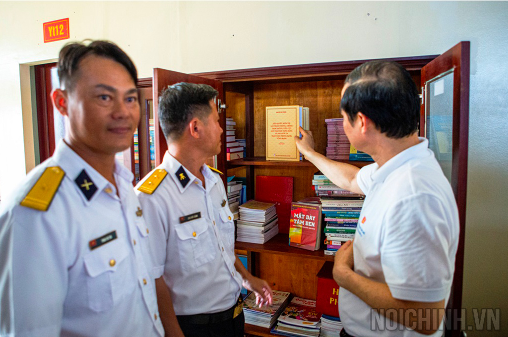 Đồng chí Nguyễn Thái Học, Phó Trưởng Ban Nội chính Trung ương giới thiệu và tặng cuốn sách của đồng chí Tổng Bí thư Nguyễn Phú Trọng tại Nhà giàn DK-1 Tư Chính