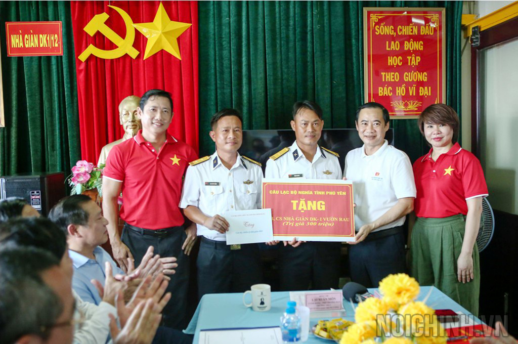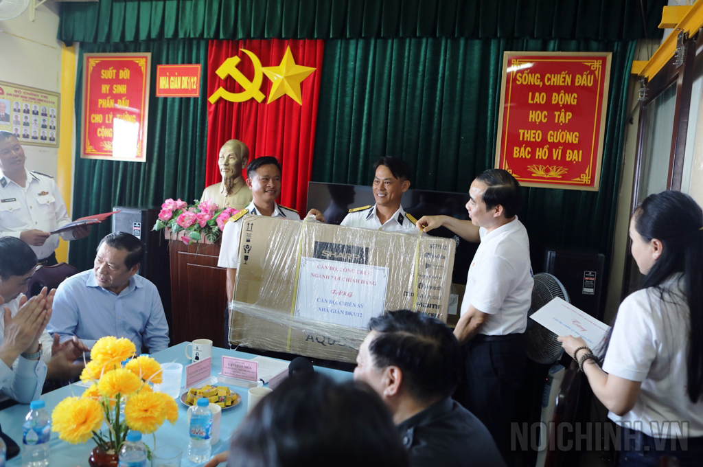 Đồng chí Nguyễn Thái Học, Phó Trưởng Ban Nội chính Trung ương, Trưởng Đoàn Đại biểu ngành Nội chính Đảng tặng quà động viên cán bộ, chiến sĩ Nhà giàn DK-1 Tư Chính