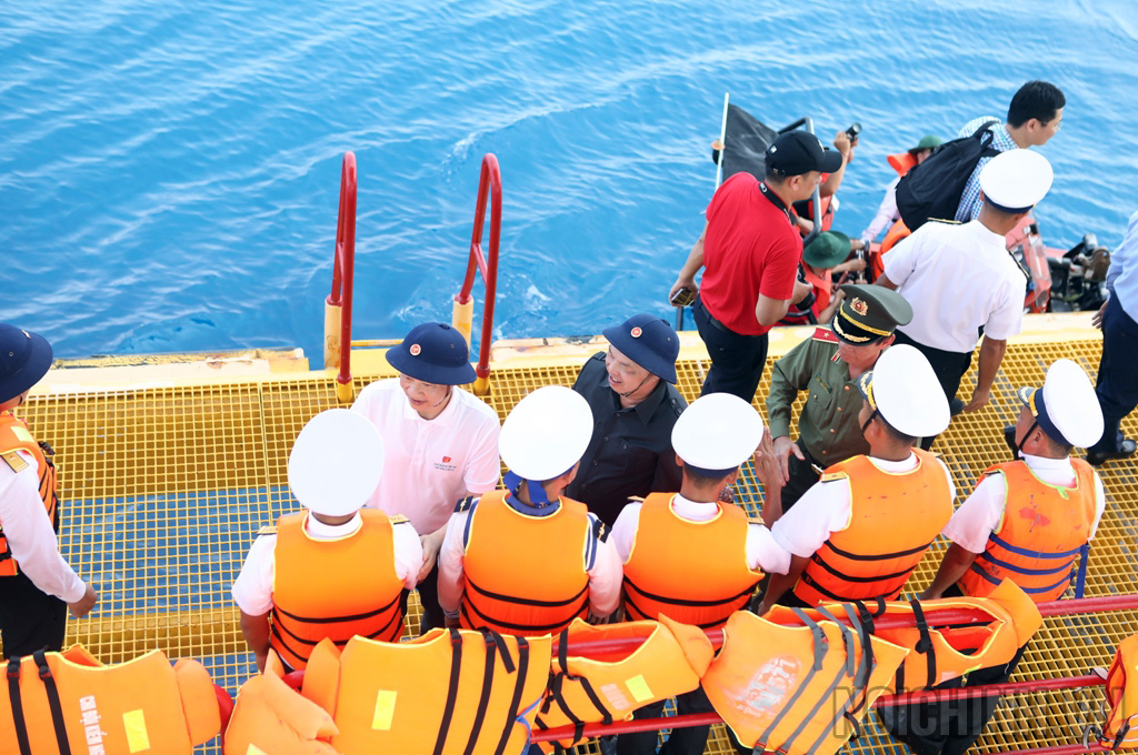 | Đồng chí Nguyễn Thái Học, Phó Trưởng Ban Nội chính Trung ương trò chuyện, thăm hỏi chiến sĩ tại Nhà giàn DK-1 Tư Chính |
