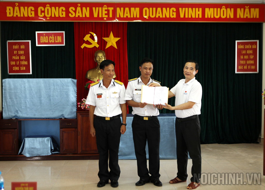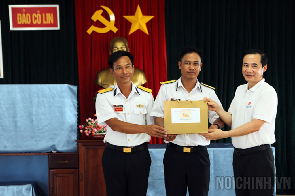 | Đồng chí Nguyễn Thái Học, Phó Trưởng Ban Nội chính Trung ương, Trưởng Đoàn Đại biểu ngành Nội chính Đảng tặng quà động viên cán bộ, chiến sĩ đảo Cô Lin |