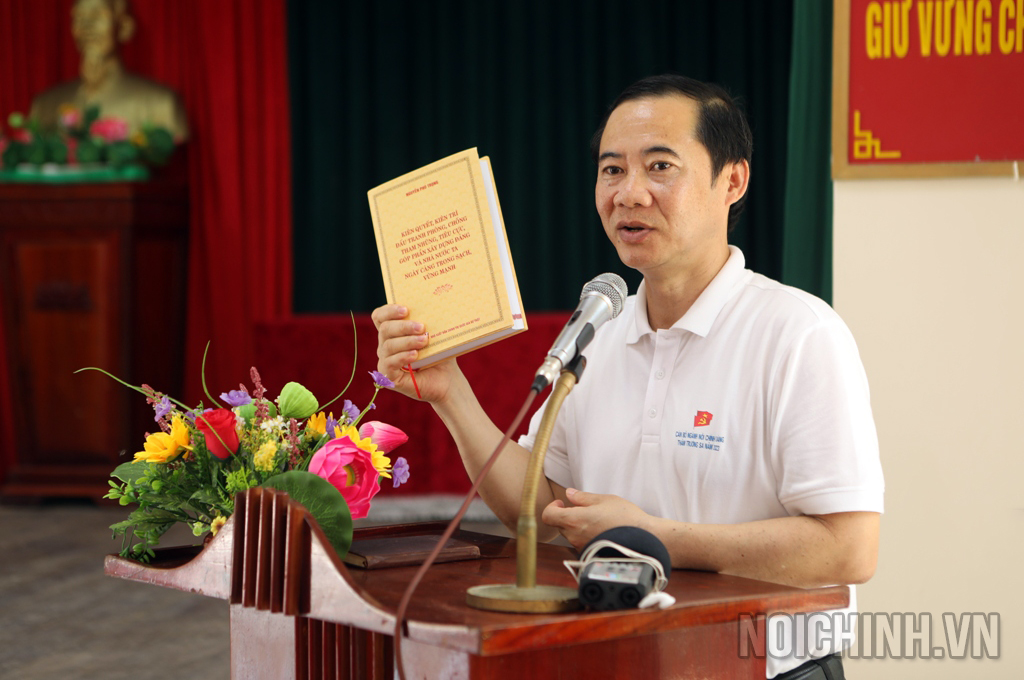 Đồng chí Nguyễn Thái Học, Phó Trưởng Ban Nội chính Trung ương giới thiệu và tặng sách của đồng chí Tổng Bí thư Nguyễn Phú Trọng cho cán bộ, chiến sĩ trên Đảo Sinh Tồn