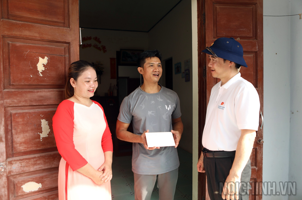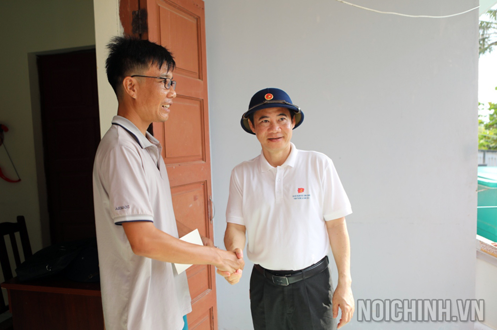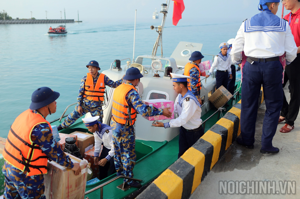 | Đồng chí Nguyễn Thái Học, Phó Trưởng Ban Nội chính Trung ương, cùng đại diện đoàn đại biểu ngành Nội chính Đảng tặng quà cho cán bộ, chiến sĩ, nhân dân trên Đảo Sinh Tồn |