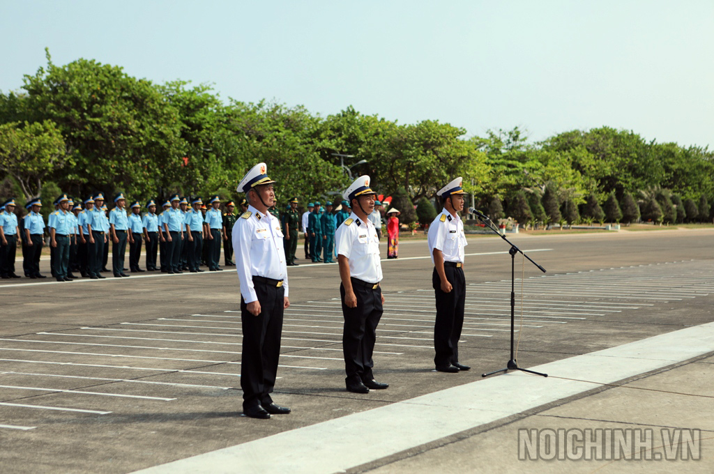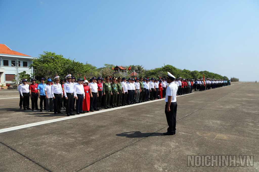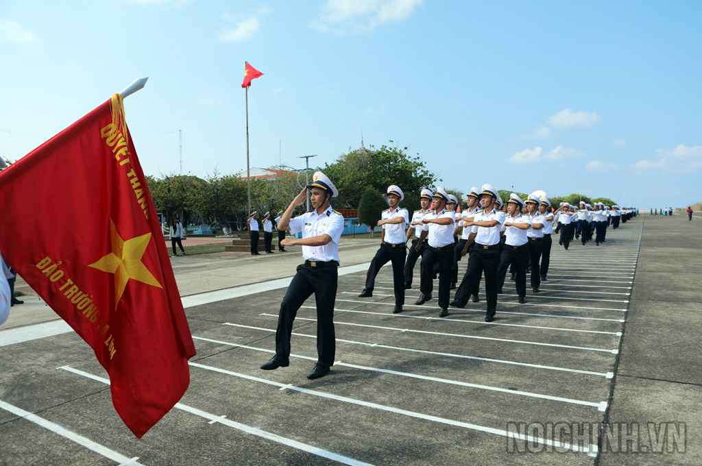Đoàn Công tác số 3 duyệt đội danh dự lễ chào cờ, duyệt đội ngũ thiêng liêng trên đảo Trường Sa lớn