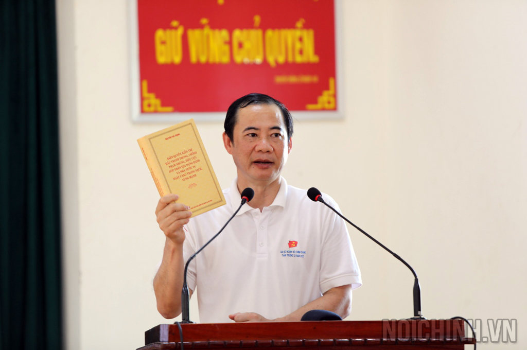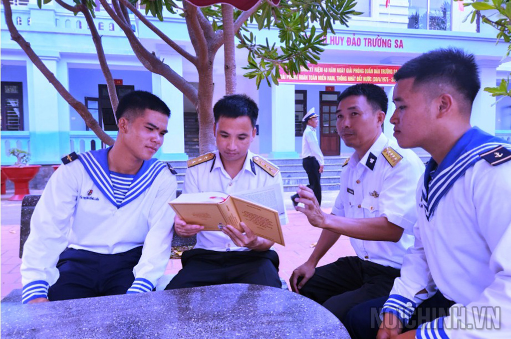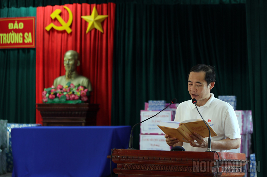 Đồng chí Nguyễn Thái Học, Phó Trưởng Ban Nội chính Trung ương đọc lời động viên của đồng chí Tổng Bí thư Nguyễn Phú Trọng và tặng sách cho cán bộ, chiến sĩ tại đảo Trường Sa lớn