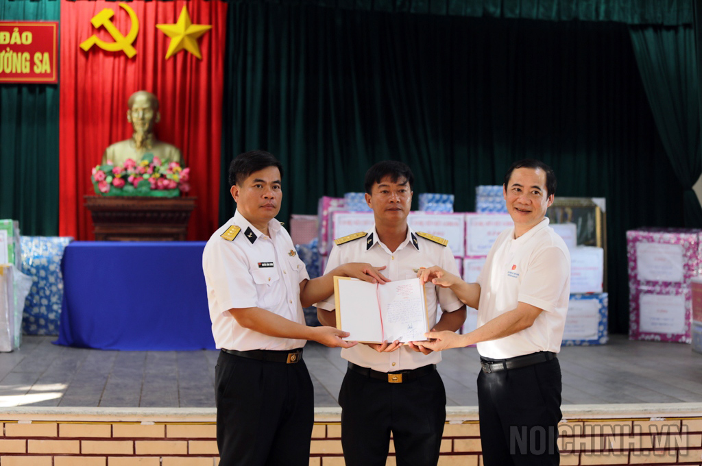 | Đồng chí Nguyễn Thái Học, Phó Trưởng Ban Nội chính Trung ương, Trưởng Đoàn và Đại biểu ngành Nội chính Đảng tặng quà lưu niệm cán bộ, chiến sĩ trên đảo Trường Sa lớn |
