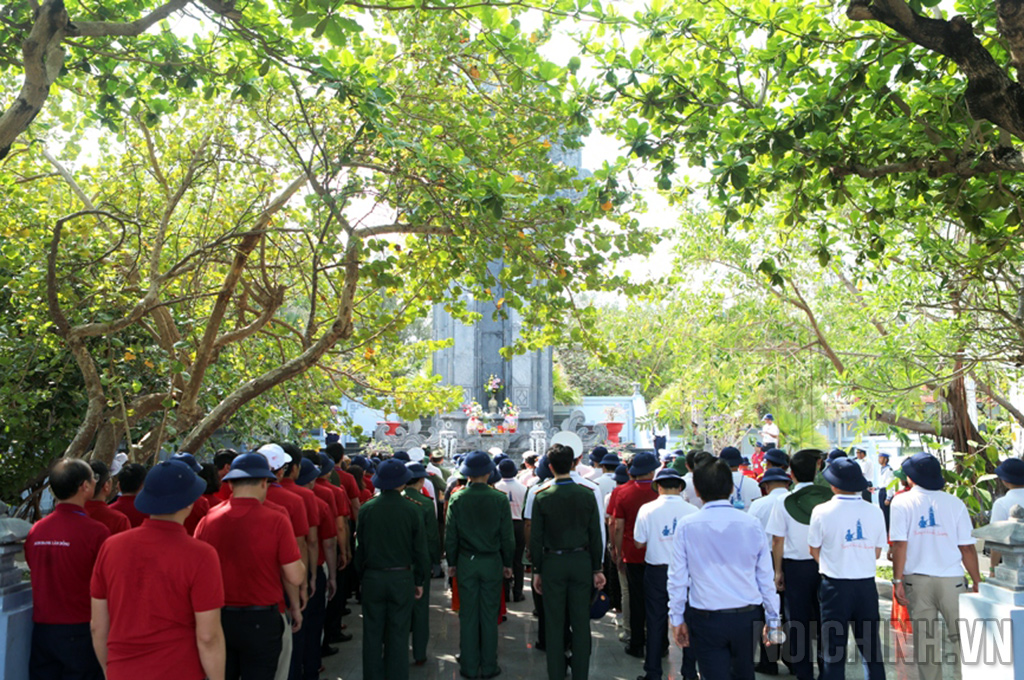 | Đoàn Đại biểu ngành Nội chính Đảng chụp ảnh lưu niệm tại cột mốc chủ quyền đảo Trường Sa lớn |