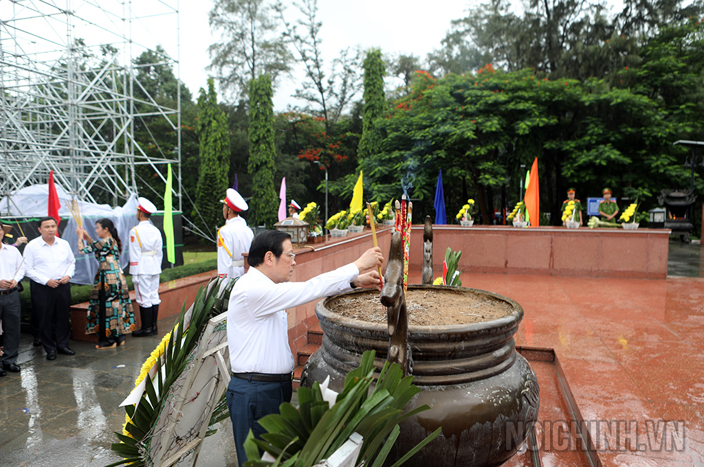 Đồng chí Phan Đình Trạc, Ủy viên Bộ Chính trị, Bí thư Trung ương Đảng, Trưởng Ban Nội chính Trung ương cùng Đoàn cán bộ mặc niệm, dâng hương tưởng nhớ các Anh hùng liệt sĩ, đồng bào yêu nước tại Tượng đài Nghĩa trang Hàng Dương