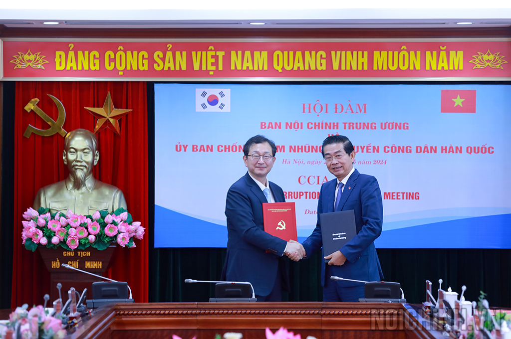 Đồng chí Võ Văn Dũng, Ủy viên Trung ương Đảng, Phó Trưởng ban Thường trực Ban Nội chính Trung ương, Ủy viên Ban Chỉ đạo Trung ương về phòng, chống tham nhũng, tiêu cực và Ông Jeong Seung-yoon, Phó Chủ tịch kiêm Tổng thư ký Ủy ban Chống tham nhũng và Quyền công dân Hàn Quốc trao đổi Thư gia hạn hợp tác giai đoạn 2024-2026