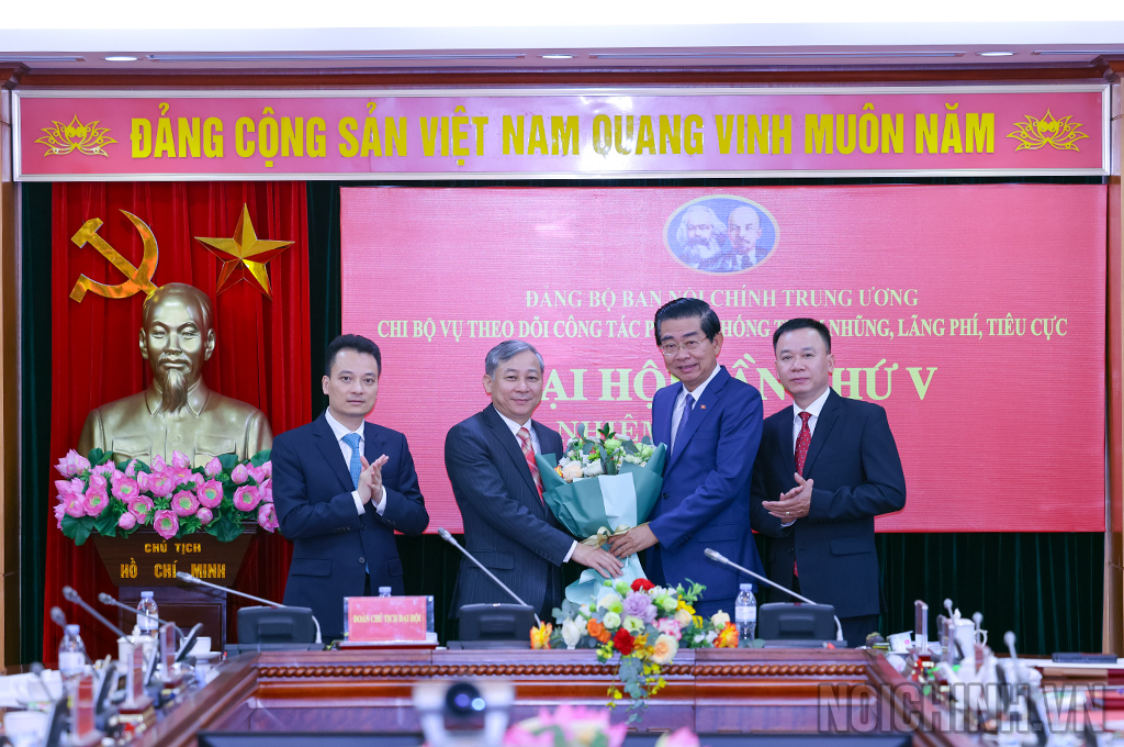 | Đồng chí Võ Văn Dũng, Ủy viên Trung ương Đảng, Phó Trưởng ban Thường trực, Bí thư Đảng ủy Ban Nội chính Trung ương tặng hoa chúc mừng Chi ủy Chi bộ Vụ Theo dõi công tác phòng, chống tham nhũng, lãng phí, tiêu cực Ban Nội chính Trung ương nhiệm kỳ 2025-2027 |