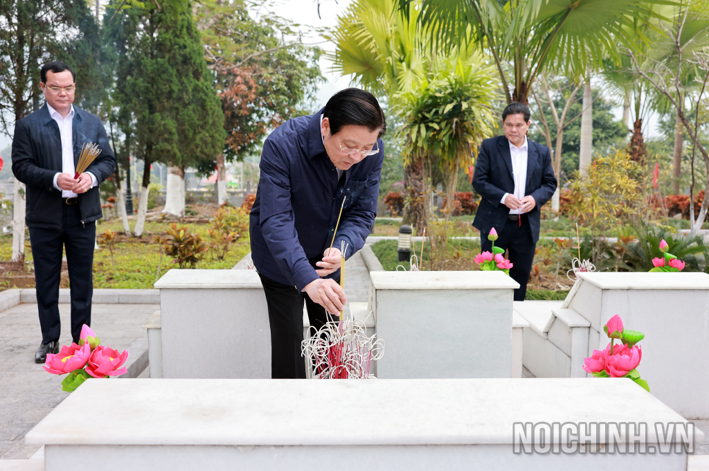 Đồng chí Phan Đình Trạc, Ủy viên Bộ Chính trị, Bí thư Trung ương Đảng, Trưởng Ban Nội chính Trung ương thắp hương phần mộ liệt sĩ tại Nghĩa trang Liệt sĩ quốc gia Vị Xuyên
