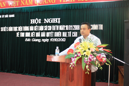 Tỉnh ủy Bắc Giang vừa tổ chức Hội nghị sơ kết 5 năm thực hiện Thông báo kết luận số 130-TB/TW ngày 10-1-2008 của Bộ Chính trị về tình hình, kết quả giải quyết khiếu nại, tố cáo (KNTC).