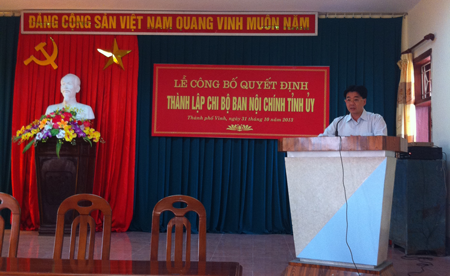 Chiều 31-10, Ban Nội chính Tỉnh uỷ Nghệ An tổ chức lễ công bố Quyết định thành lập Chi bộ đảng cơ sở và chỉ định chi uỷ lâm thời. Lễ công bố Quyết định thành lập Chi bộ Đảng Ban Nội chính Tỉnh uỷ được thực hiện theo sự chỉ đạo của Đảng ủy khối các cơ quan cấp tỉnh về việc thành lập Chi bộ Đảng CSVN.