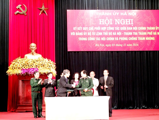 Chiều 3-11, Thành ủy Hà Nội tổ chức Hội nghị ký kết Quy chế phối hợp giữa Ban Nội chính Thành ủy Hà Nội với Đảng ủy Bộ Tư lệnh Thủ đô và Thanh tra thành phố. Tham dự Lễ ký có đại diện lãnh đạo Vụ Địa phương - Ban Nội chính Trung ương, Cục Phòng chống tham nhũng - Thanh tra Chính phủ, Thanh tra Bộ Quốc phòng. Đồng chí Ngô Thị Thanh Hằng, Ủy viên Trung ương Đảng, Phó Bí thư Thường trực Thành ủy dự và chứng kiến Lễ ký.