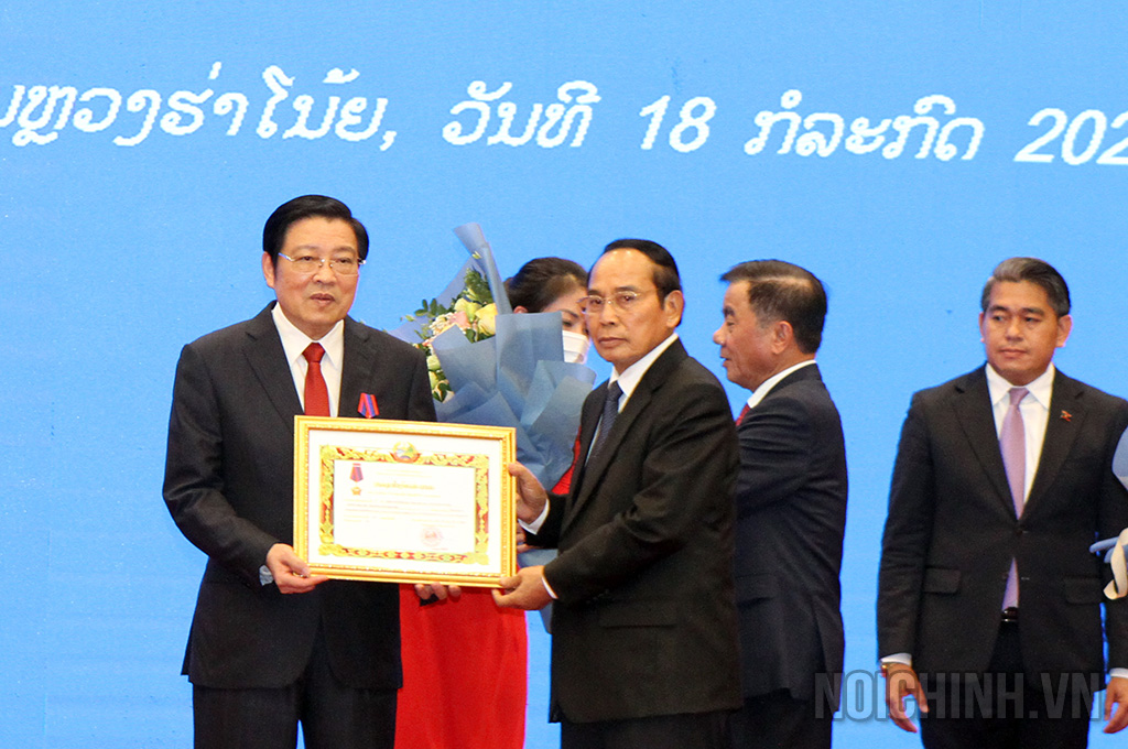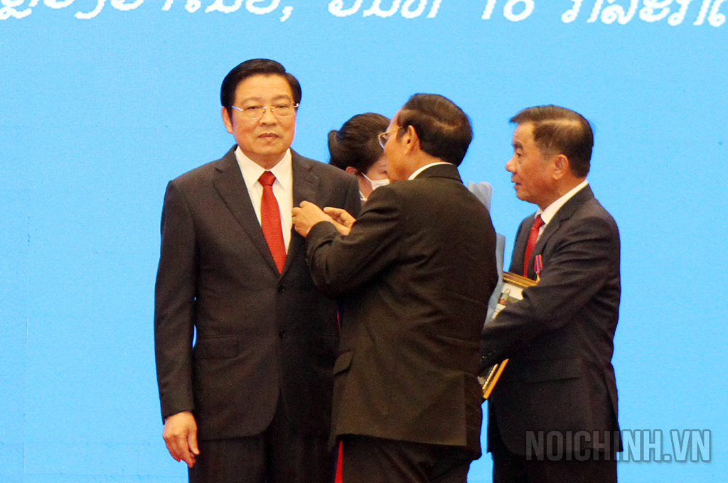 | Đồng chí Bounthong Chitmany, Ủy viên Bộ Chính trị, Thường trực Ban Bí thư Trung ương Đảng Nhân dân Cách mạng Lào, Phó Chủ tịch nước Cộng hòa Dân chủ Nhân dân Lào trao tặng Huân chương Tự do Hạng Nhất (ISALA) của Lào cho đồng chí Phan Đình Trạc, Ủy viên Bộ Chính trị, Bí thư Trung ương Đảng, Trưởng Ban Nội chính Trung ương |