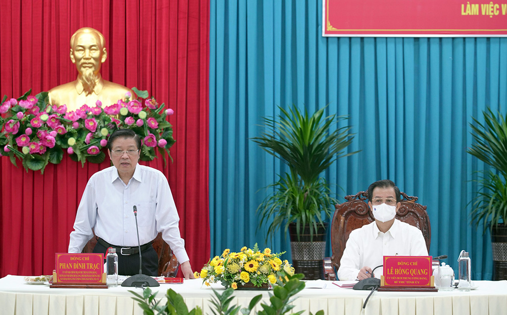 Đồng chí Phan Đình Trạc, Ủy viên Bộ Chính trị, Bí thư Trung ương Đảng, Trưởng Ban Nội chính Trung ương, Phó Trưởng ban Thường trực Ban Chỉ đạo Trung ương về phòng, chống tham nhũng, tiêu cực, Phó Trưởng ban Thường trực Ban Chỉ đạo Cải cách tư pháp Trung ương làm việc tại An Giang